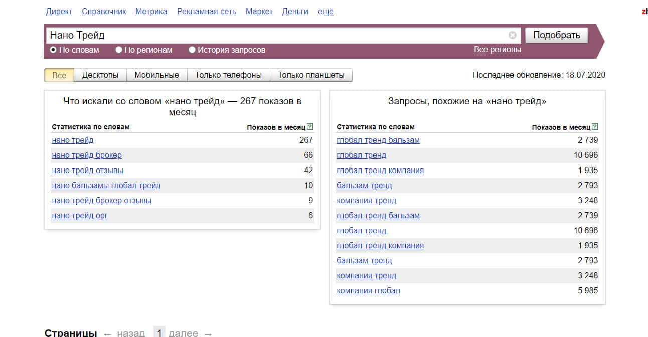 А вот какой результат выходит по запросу на бренд "Нано Трейд" с пробелом: 267 показов в месяц.