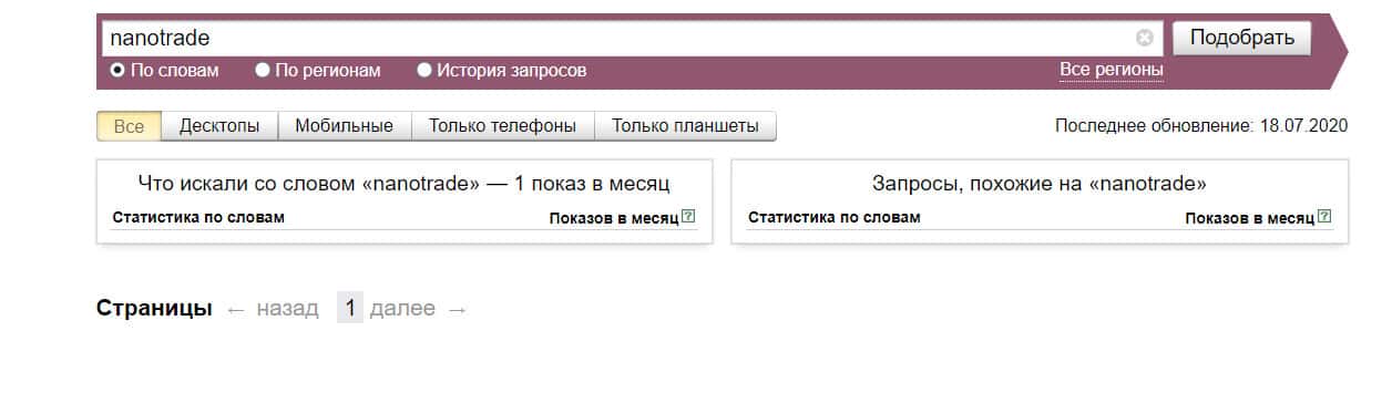 Название бренда "nanotrade" на английском языке пользователи искали в системе Яндекс всего лишь один раз.