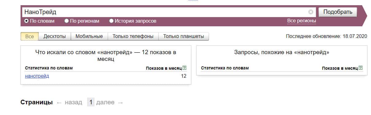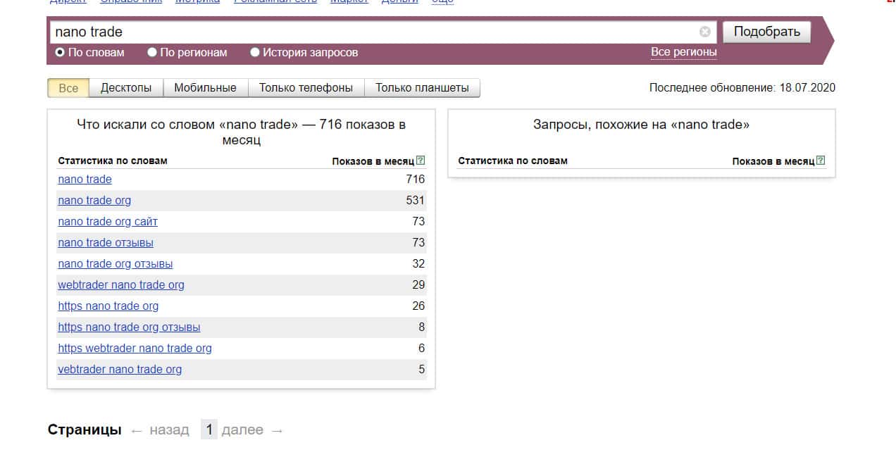 Название компании "nano trade", написанное с пробелом, пытались найти в поисковике 716 раз за месяц.