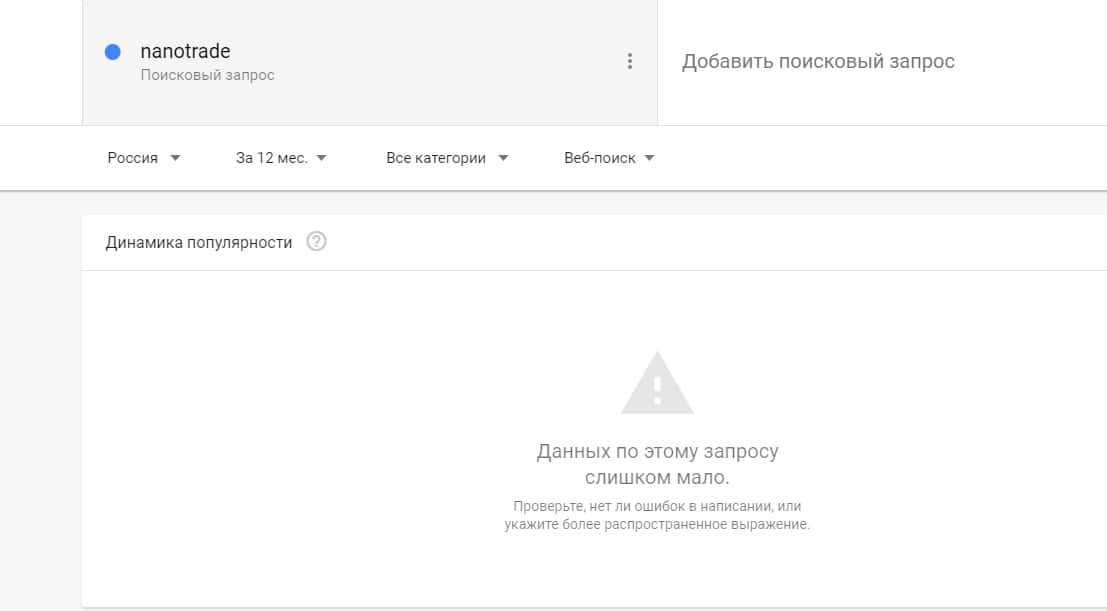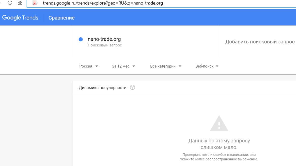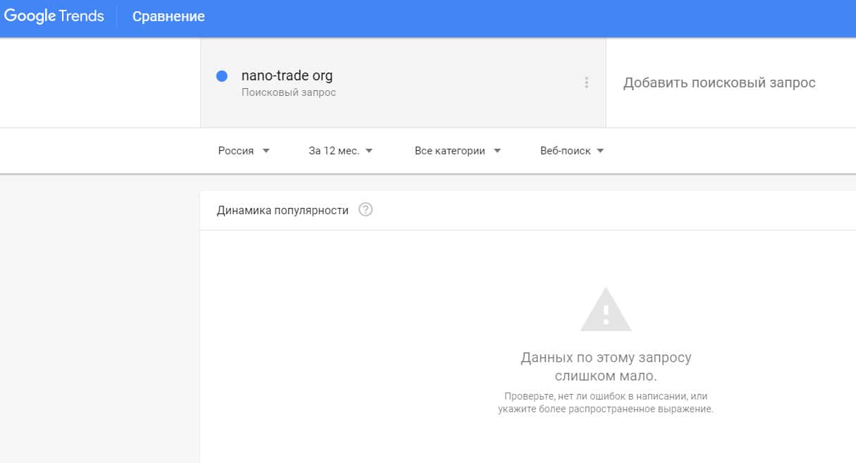 Как показывает сервис Гугл Тренд, доменное имя "nano-trade.org" с точкой пользователи искали в поисковой системе крайне редко.
