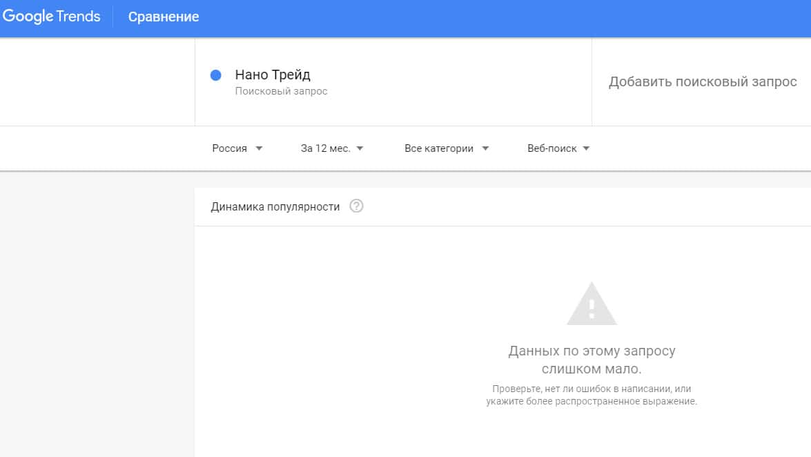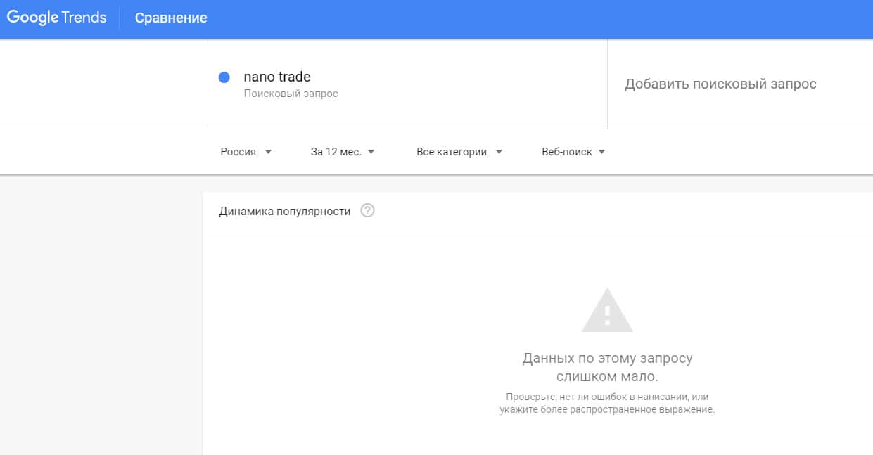 Количество запросов от пользователей по доменному имени "nano-trade org" в сервисе Гугл Тренд было очень небольшим. Компания не популярна у англоязычных трейдеров.