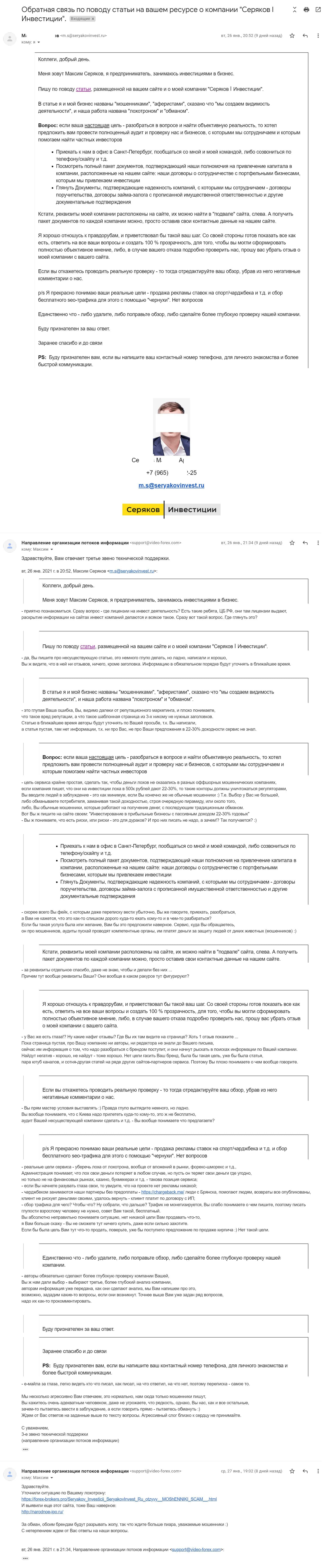- Официальная переписка с основной мошеннической компанией Серяков Инвестиции, он же Народное АйПиО