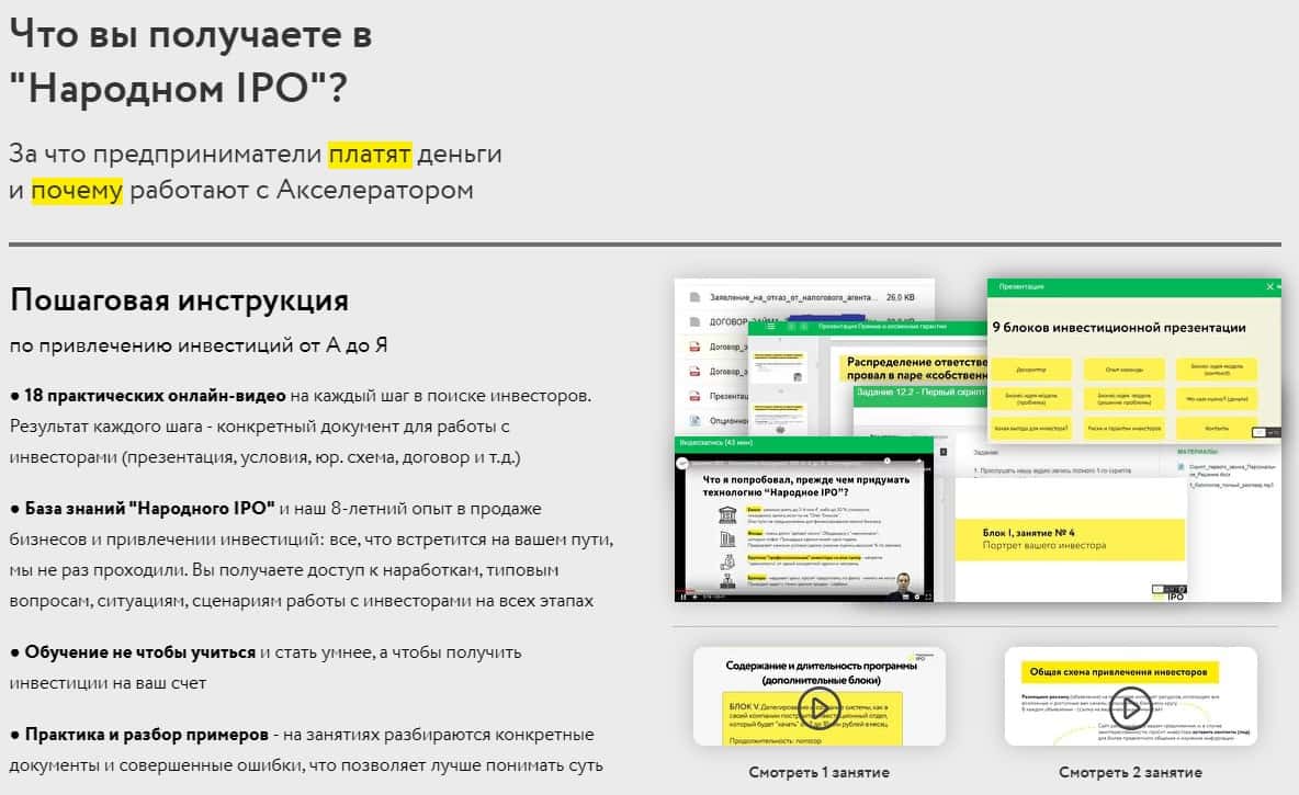 В состав фейковой программы по привлечению инвестиций Narodnoe-IPO Ru входит: 18 практических онлайн-видео, база знаний "Народного IPO". В общем, уйма ненужного хлама.