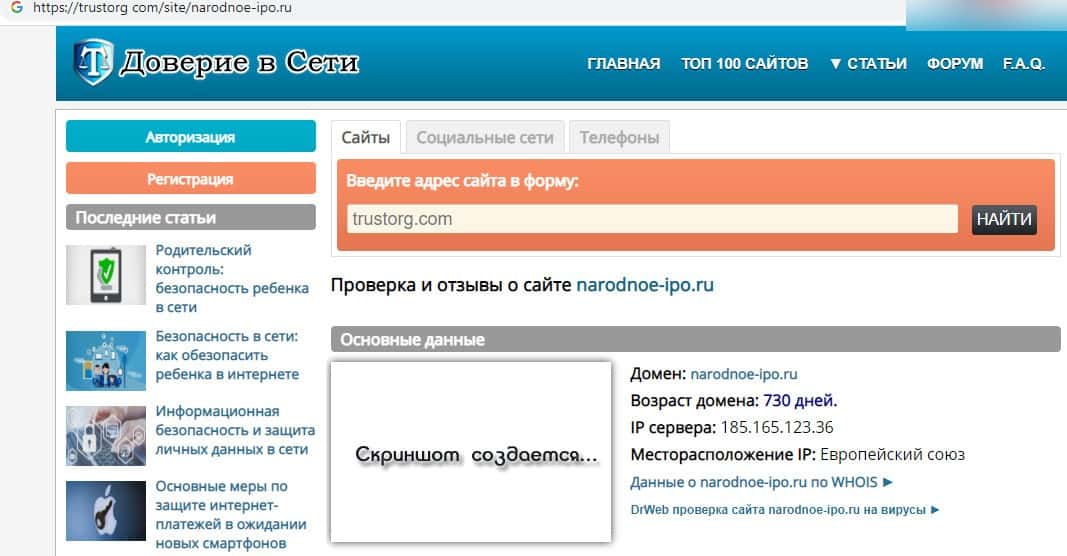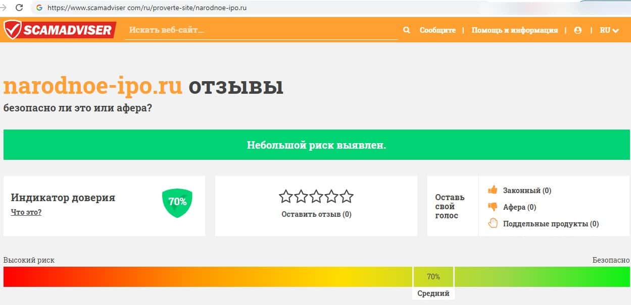 Зашкварный центр Narodnoe-IPO Ru, по мнению уважаемого интернет-ресурса scamadviser com имеет небольшой риск, а сам сайт средний риск. Связываться с жуликами - огромный риск.