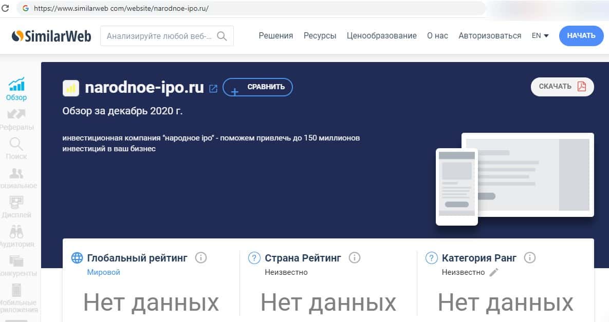 Интернет-страница similarweb com не имеет никакой точной информации о веб-ресурсе фиктивной конторы Narodnoe-IPO Ru. Лучше не связываться с подобными ворюгами.