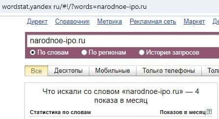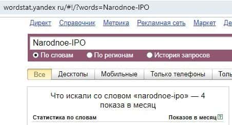 По запросу "narodnoe-ipo.ru" Яндекс Вордстат показал количество всего 4 раза, это свидетельствует о еще не совсем достаточной популярности данной фиктивной конторы.
