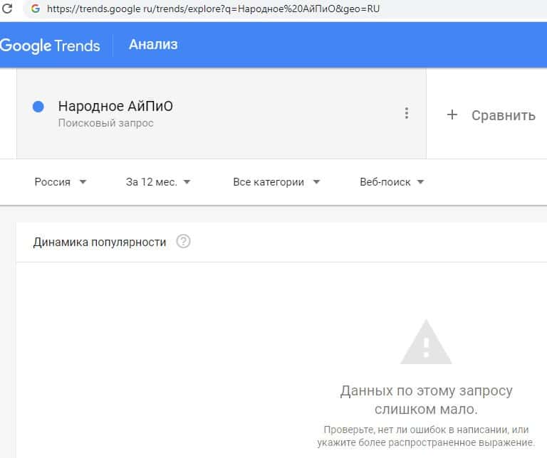 Что касается доменного имени "Народное АйПиО" на русском языке, написанного с одним пробелом, вообще не предоставил ни единого результата по поиску на ресурсе Гугл Трендс.