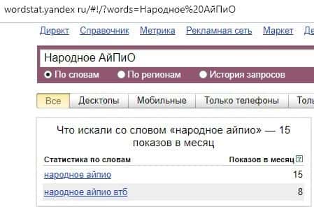 Поиск брендового имени "Народное АйПиО" стал средним по популярности среди интернет-пользователей на странице wordstat yandex ru, так как набрал 15 запросов за месяц.