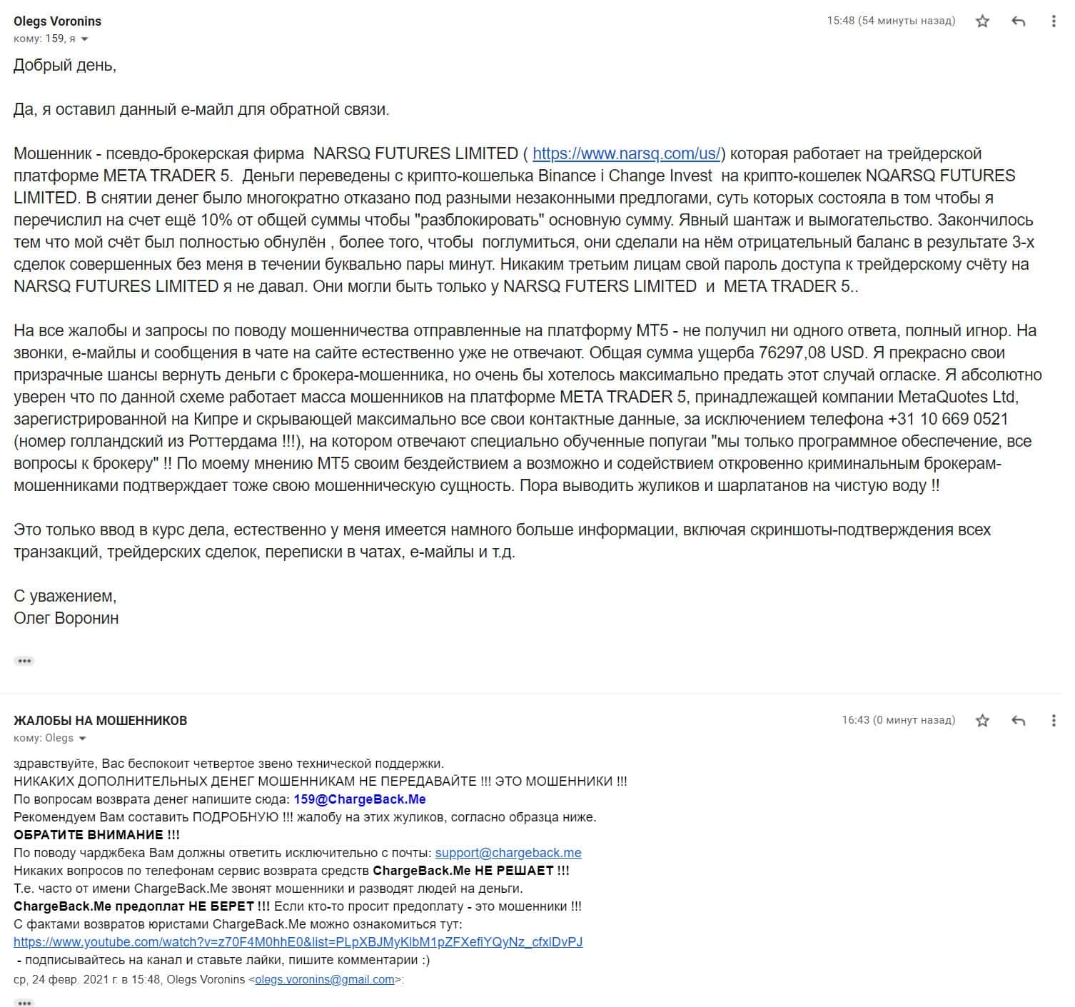 Перед вами отзыв на фирму жуликов, в которой пользователь рассказал как стал жертвой мошенничества со стороны Narsq, Binance и ChangeInvest, а также МетаТрейдер 5, в результате которого потерял 76297 долларов.