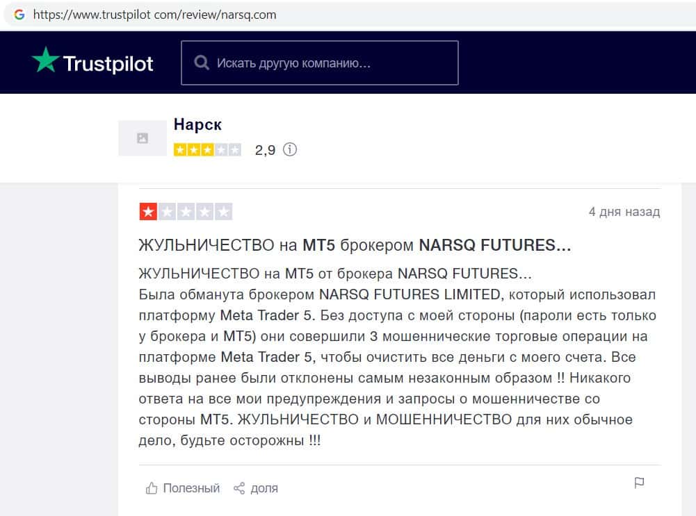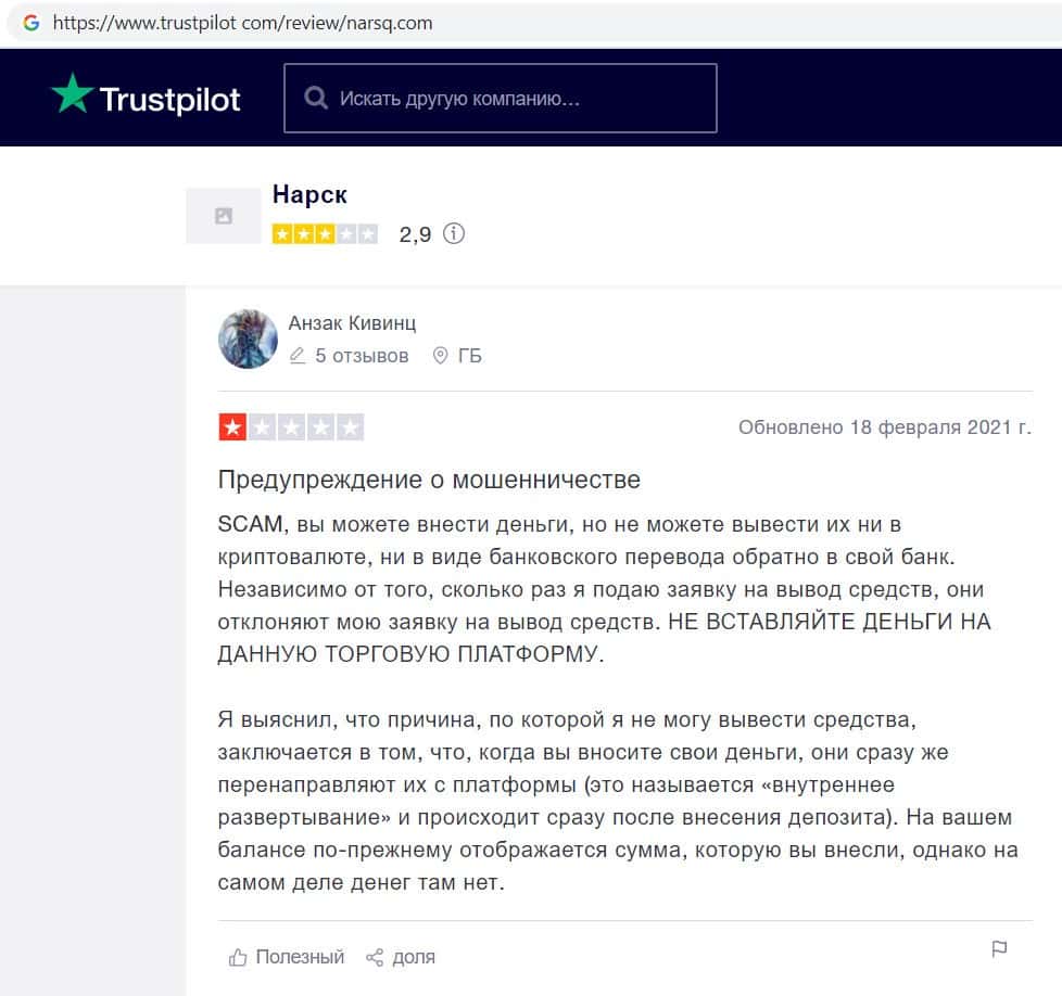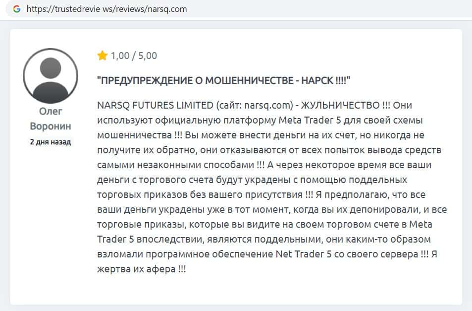 Автор данного отзыва написал, что столкнулся с мошенничеством со стороны фирмы Narsq. Компания просто на просто слила все его средства через свою мошенническую платформу.