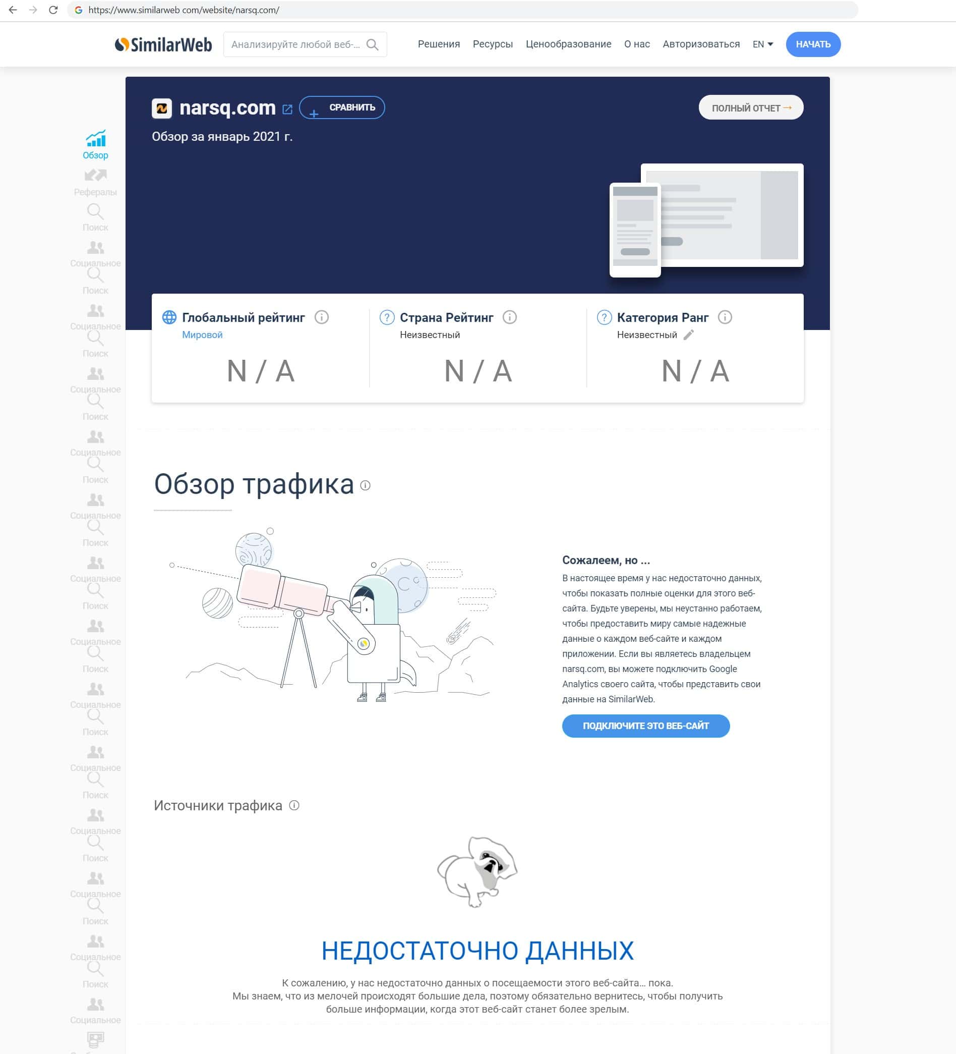 Мы воспользовались сайтом similarweb com для того, чтобы узнать трафик главного сайта разводил Нарск. Оказалось, что международный сервис не обладает данной информацией.