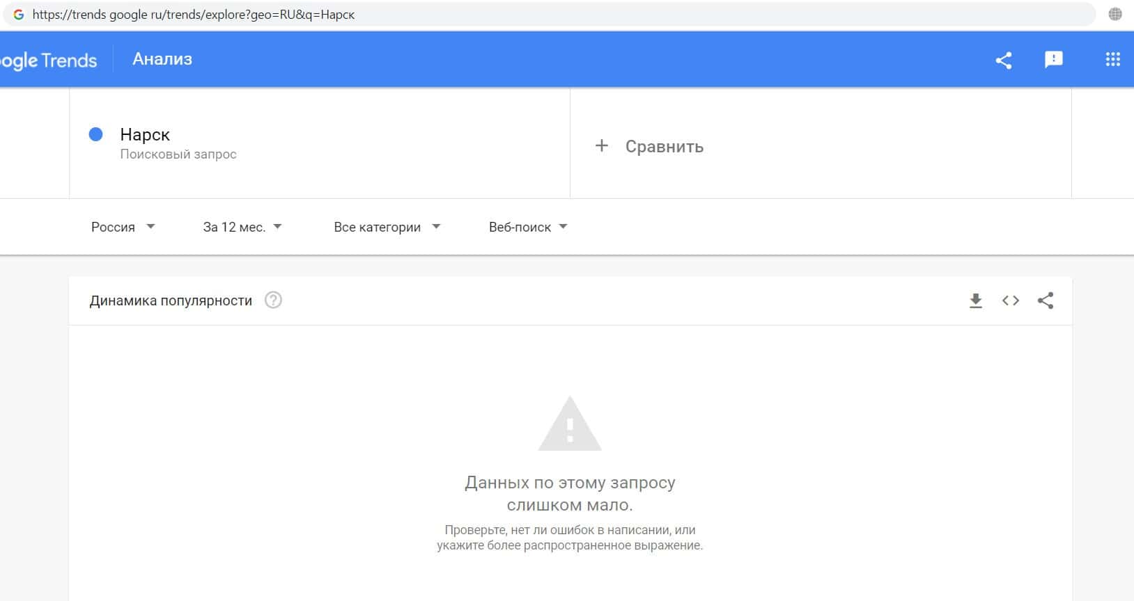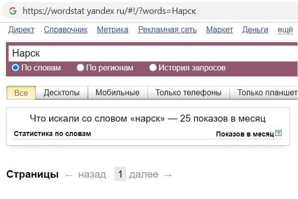 Далее мы проверили количество запросов конторы жуликов Narsq по русскоязычному названию конторы, а именно "Нарск". Данный запрос пользователи выполнили всего 25 раз.