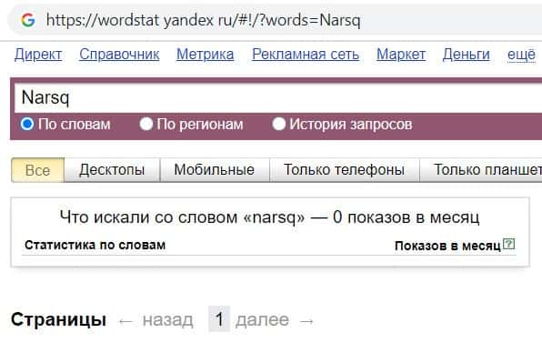 Мы проверили количество запросов компании мошенников Narsq в Яндексе по названию фирмы, а именно "Narsq". Оказалось, что данный запрос пользователи не выполняли.