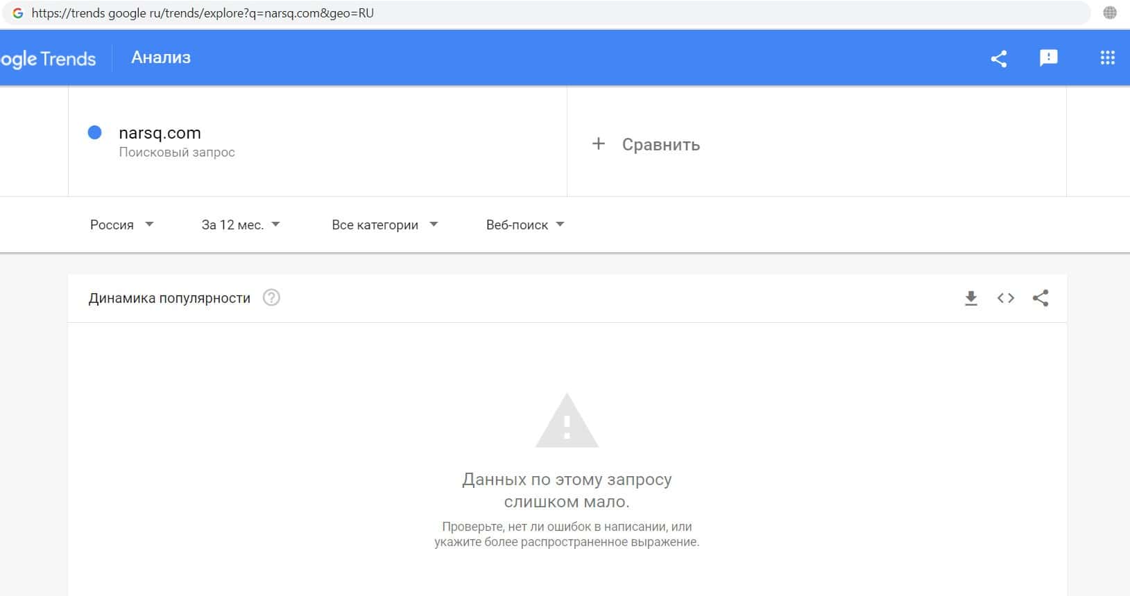 Мы проверили количество запросов лохотрона Narsq в Google по названию конторы, а именно "Narsq". Оказалось, что данный запрос пользователи не выполняли целый год.