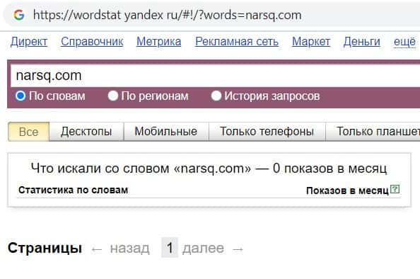 Проверили мы так же количество запросов Финансовых аферистов Нарск в Яндексе по домену с точкой, а именно "narsq.com", но и этот запрос пользователи не выполняли.