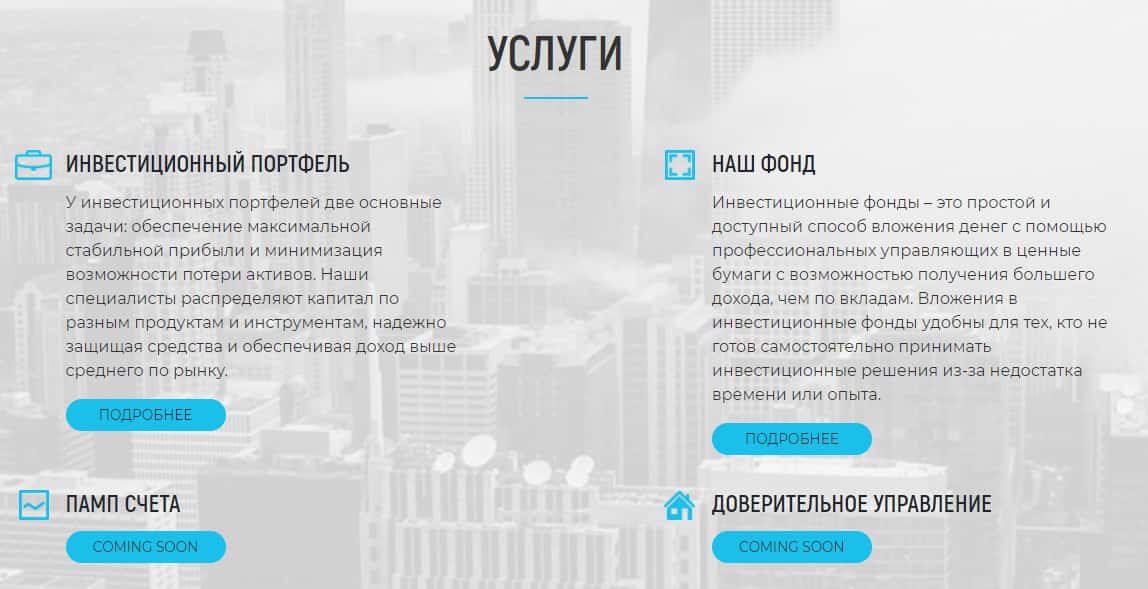 После на подвальном сайте аферистов ФондРу Ком следует довольно типичный и банальный раздел с довольно сомнительными преимуществами и услугами мошенников FondRu Com, под предлогом которых они пытаются навязать свою контору. На изображении, расположенном ниже, вы можете увидеть данный раздел сайта жулья.