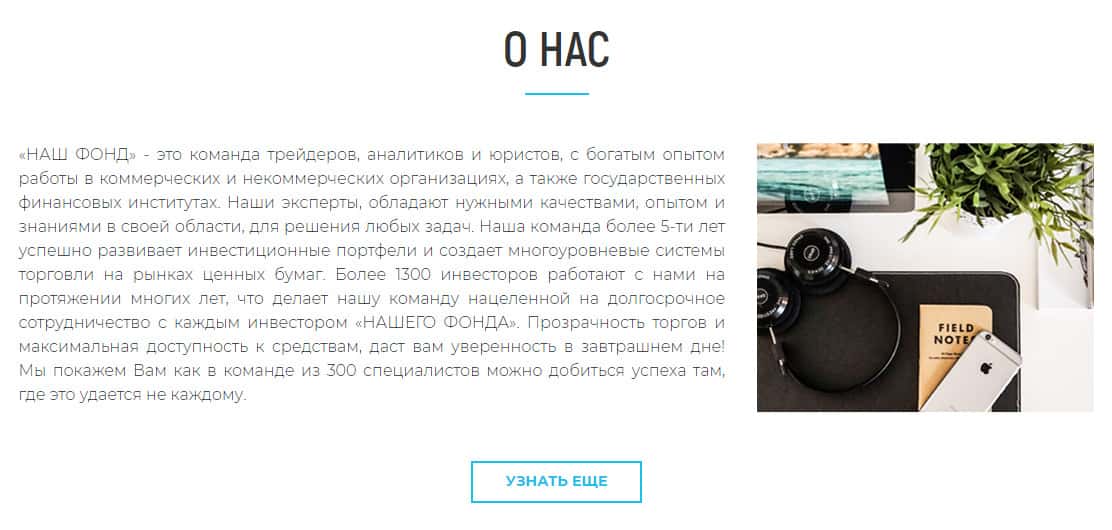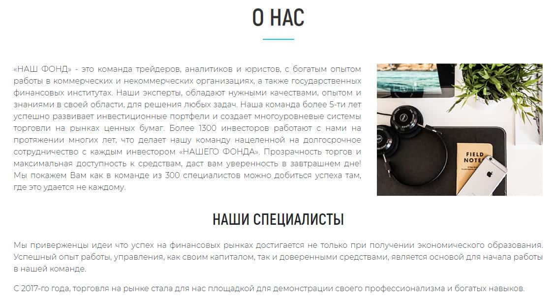 Наш Фонд - очередные мошенники сети интернет, которые занимаются наглым разводом наивных пользователей сети интернет под довольно банальным и типичным предлогом инвестиций, в ходе которых на пару с жульем ЛЕД Капитал и шулерами Симпел Маркетс и аферистами Экспо Трейд нагло кидают клиентуру на деньги, в связи с чем связываться не рекомендуем !!!