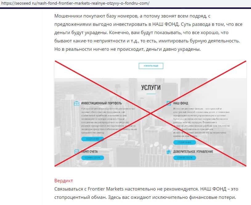 В связи с мошеннической и противозаконной деятельностью аферистов ФондРу Ком на просторах сети интернет веб-площадка сеосеед ру посвятила жуликам FondRu Com целую статью, по итогам которой сайт seoseed ru определенно не рекомендует иметь дело с шулерами Наш Фонд, о чем вы можете прочесть на изображении, расположенном ниже.