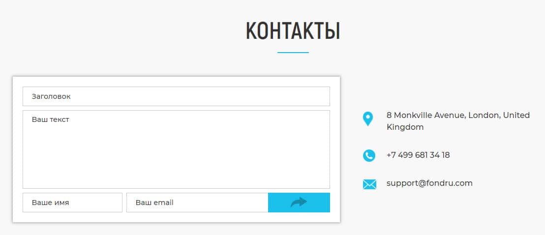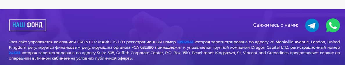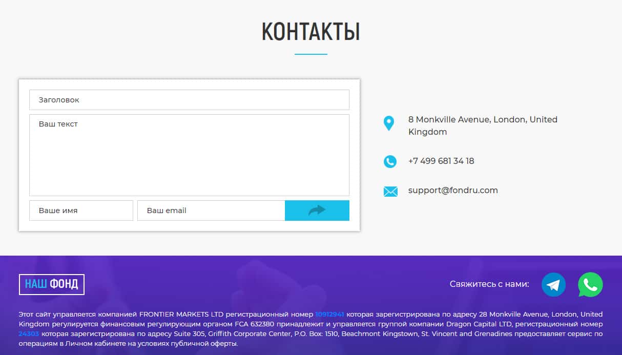 Завершается сайт у лохотрона ФондРу Ком вполне ожидаемо, а именно информацией о том, что аферисты FondRu Com зарегистрированы непосредственно в оффшоре, а так же контактной формой для связи с наивной клиентурой. На изображении, расположенном ниже, вы можете увидеть окончание подвального сайта мошенников Наш Фонд.