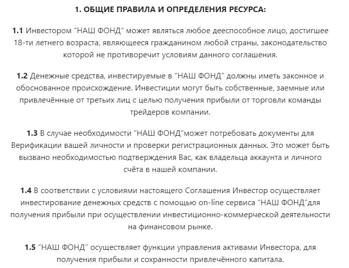 После в данных условиях аферисты ФондРу Ком говорят о том, что наивные пользователи соглашаются с данными условиями сотрудничества фактом своей регистрации на данном подвальном сайте FondRu Com. На изображении, расположенном ниже, вы можете увидеть очередной раздел условий клиентского соглашения мошенников Наш Фонд.