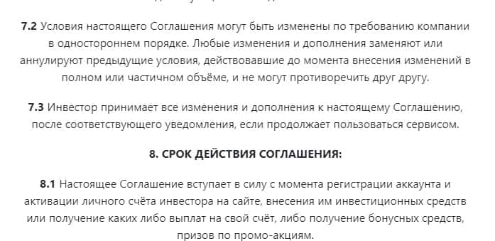 Завершаются же условия сотрудничества у лохотрона FondRu Com довольно банально и ожидаемо, а именно условием о том, что мошенники Наш Фонд могут в любой момент по своему усмотрению изменить данные условия сотрудничества без предварительного уведомления. Ниже вы можете увидеть окончание условий шулеров.
