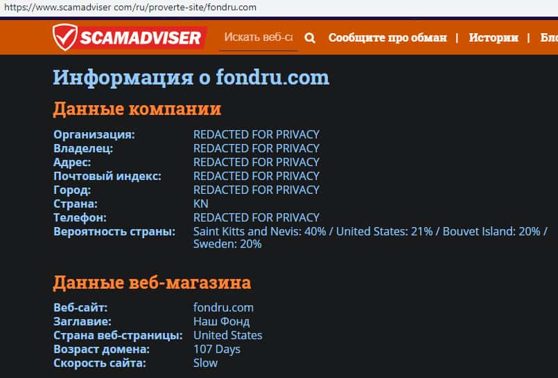 В связи с мошеннической и противозаконной деятельностью лохотрона FondRu Com его реальные руководители предпочитают анонимность дабы избежать ответственности со стороны правоохранительных органов. Техническую же информацию о сайте мошенников Наш Фонд можно узнать с помощью портала scamadviser com, что вы можете увидеть ниже.