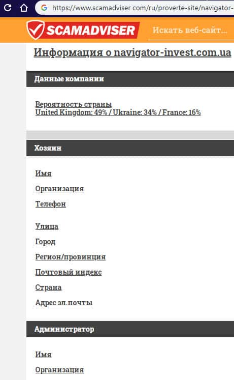 В связи с мошеннической и противозаконной деятельностью лохотрона Navigator Invest его реальные руководители предпочитают анонимность дабы избежать ответственности со стороны правоохранительных органов. Техническую же информацию о сайте жулья Навигатор Инвест можно узнать с помощью портала scamadviser com, что вы можете увидеть ниже.