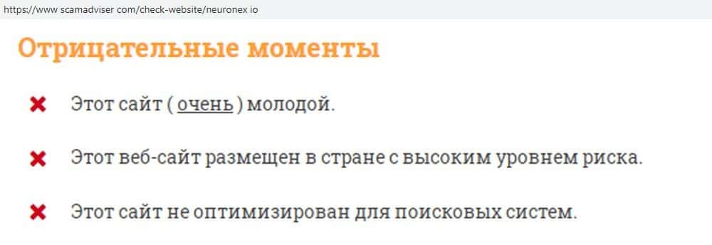 Веб-площадка скамэдвайзер ком предупреждает, что сайт мошенников NeuronEX лучше обходить стороной: появился совсем недавно, а еще его почему-то прячут от поисковых систем.