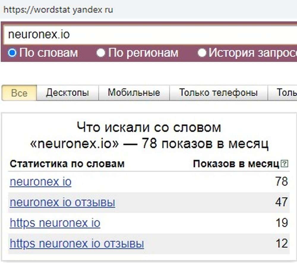 То же самое касается сайта. По запросу "neuronex.io" 78 показов. Пользователи сети ищут отзывы об этом лохотроне, чтоб решить, можно ли ему доверять. Они могут попасть в ловушку.