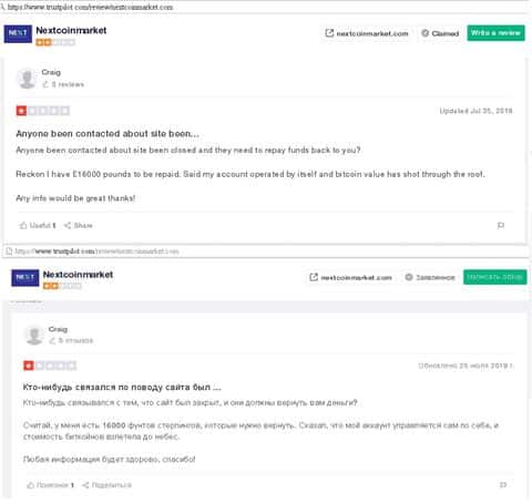 На веб-ресурсе trustpilot com трейдеры, обманутые жуликами из NextCoinMarket, пытаются найти способ вернуть деньги и делятся неприятным опытом. У одного из них кидалы NextCoinMarket выманили 16000 фунтов стерлингов и заблокировали доступ к аккаунту по непонятным причинам.