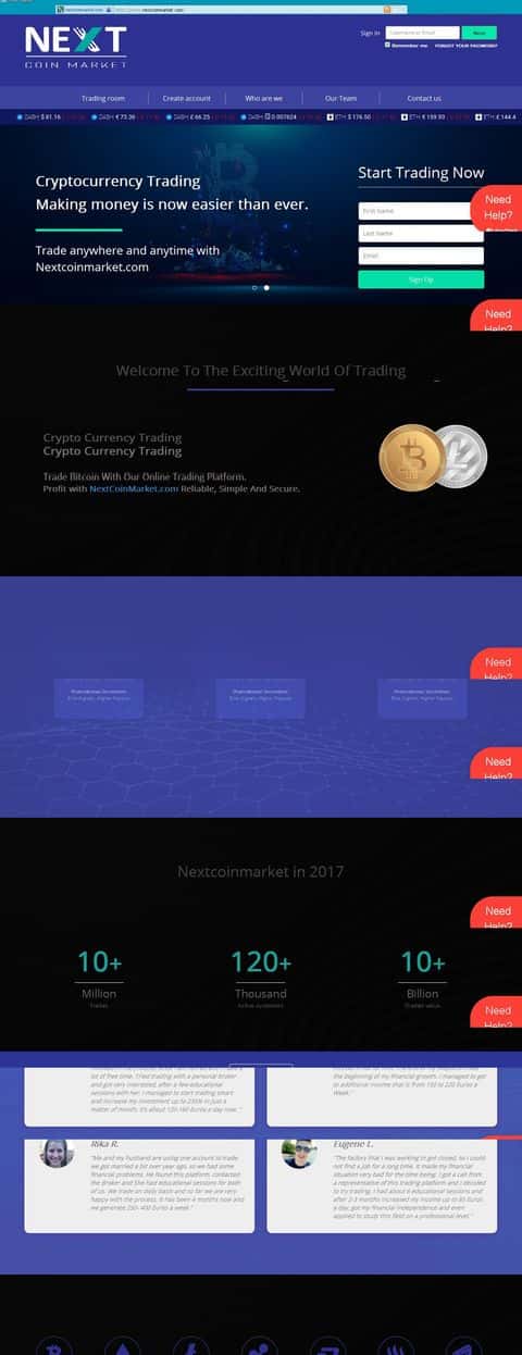 Веб-страница лохотронщиков Некст Коин Маркет выглядит солидно - видно, что они нацелены не только на новичков, но и на опытных трейдеров, которые вкладывают более крупные суммы. На первый взгляд здесь есть все информация, которую предоставил бы честный брокер - информация о компании, соглашения и даже фейковые отзывы.