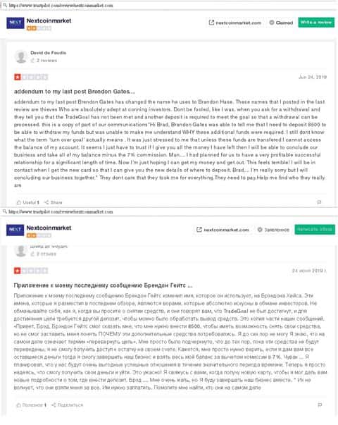 Портал трастпилот ком предоставил жертвам аферистов NextCoinMarket возможность высказаться. Как говорит один из пострадавших, его обрабатывал скаммер Брэндон Гейтс, один из "ведущих" специалистов по разводу. Мошенник из NextCoinMarket требовал внести 8,5 тысяч чтобы якобы вывести средства, которые уже были на счету.