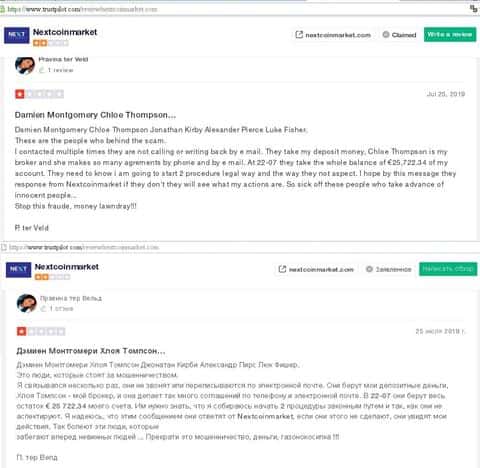 Один из реальных трейдеров, некая Правина, оставила отзыв на веб-ресурсе трастпилот ком. Она называет имена мошенников, которые работают под "брендом" Некст Коин Маркет! Это Дэмиен Монтгомери, Хлоя Томпсон, Джонатан Кирби, Александр Пирс, Люк Фишер. Хлоя Томпсон кинула девушку больше чем на 25 тысяч евро!