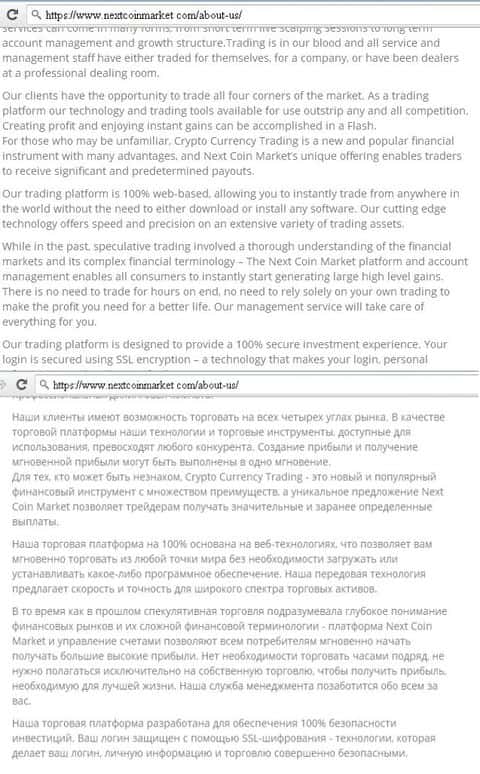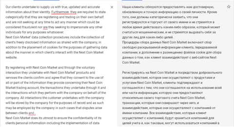 В соглашении о политике конфиденциальности жулики Некст Коин Маркет требуют от клиентов максимальной личной информации. Также они сообщают, что сайт будет собирать информацию о действиях трейдеров. Как и клиентское соглашение, раздел о политике конфиденциальности написан с ошибками.