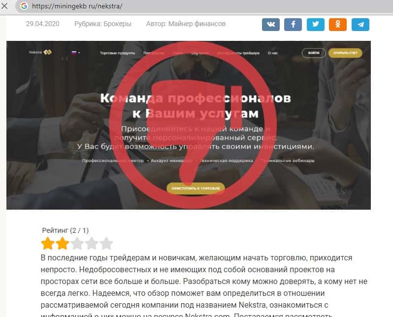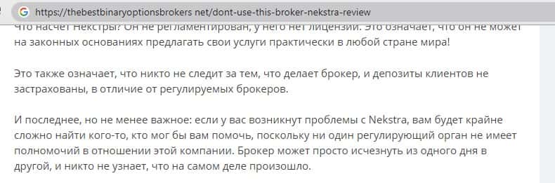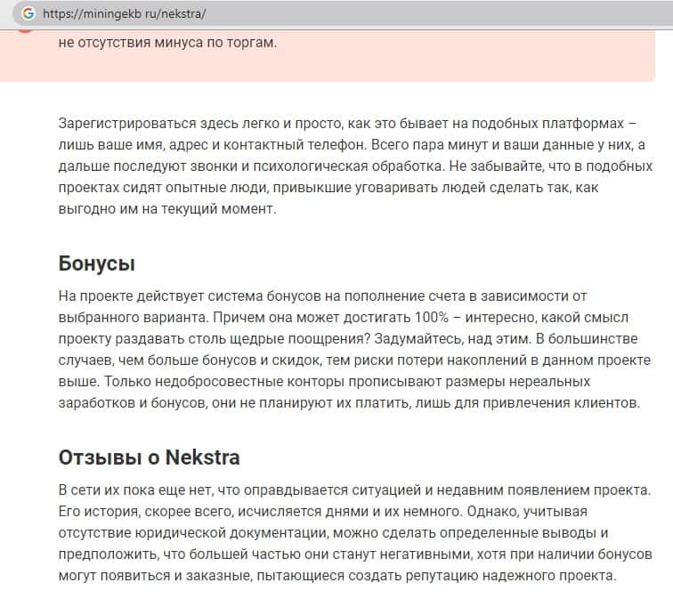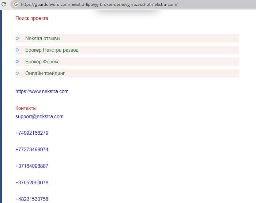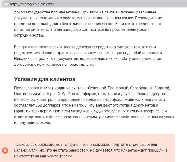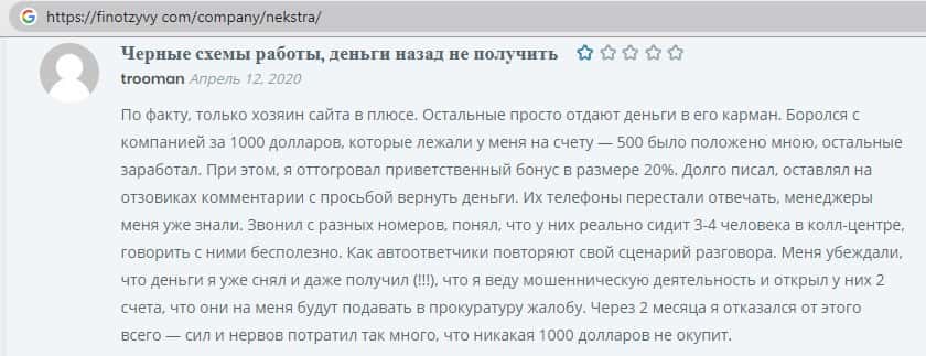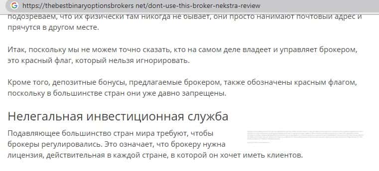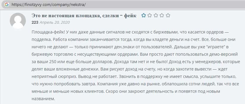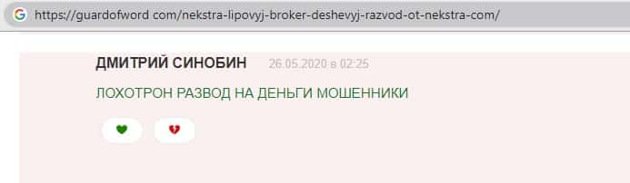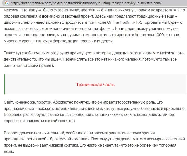 Большой минус подвального сайта Nekstra, наличие отзывов. Причем эти корявые отзывы от знаменитых брокеров которые контрастируют на визуальном и текстовом фоне сайта. Нам рассказывают, какая это негативная компания, и в подтверждение показывают достоверные доказательства о мошенниках Некстра.