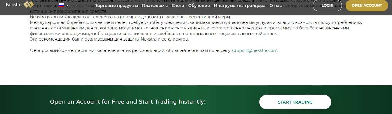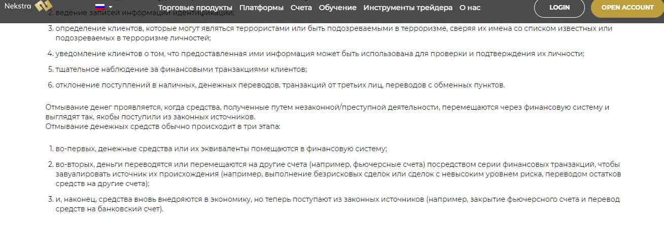 Судя по словам лохотронщиков Nekstra, они не поощряют отмывания денег и поддерживают борьбу с легализацией денежных средств, полученных преступным путем. Их компания следует принципам, установленным объединенной группой по борьбе с отмыванием денег.