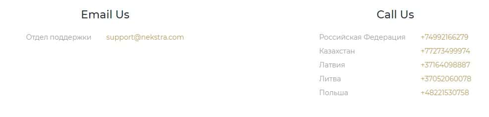 Компания лохотронщиков разместила на своём портале информацию о своих контактах, но решила там написать только номера телефонов. Видно всё таки мошенники Некстра осознают, что производят не правомерные действия по отношению к своим трейдерам. На изображении ниже вы можете увидеть данные контакты: