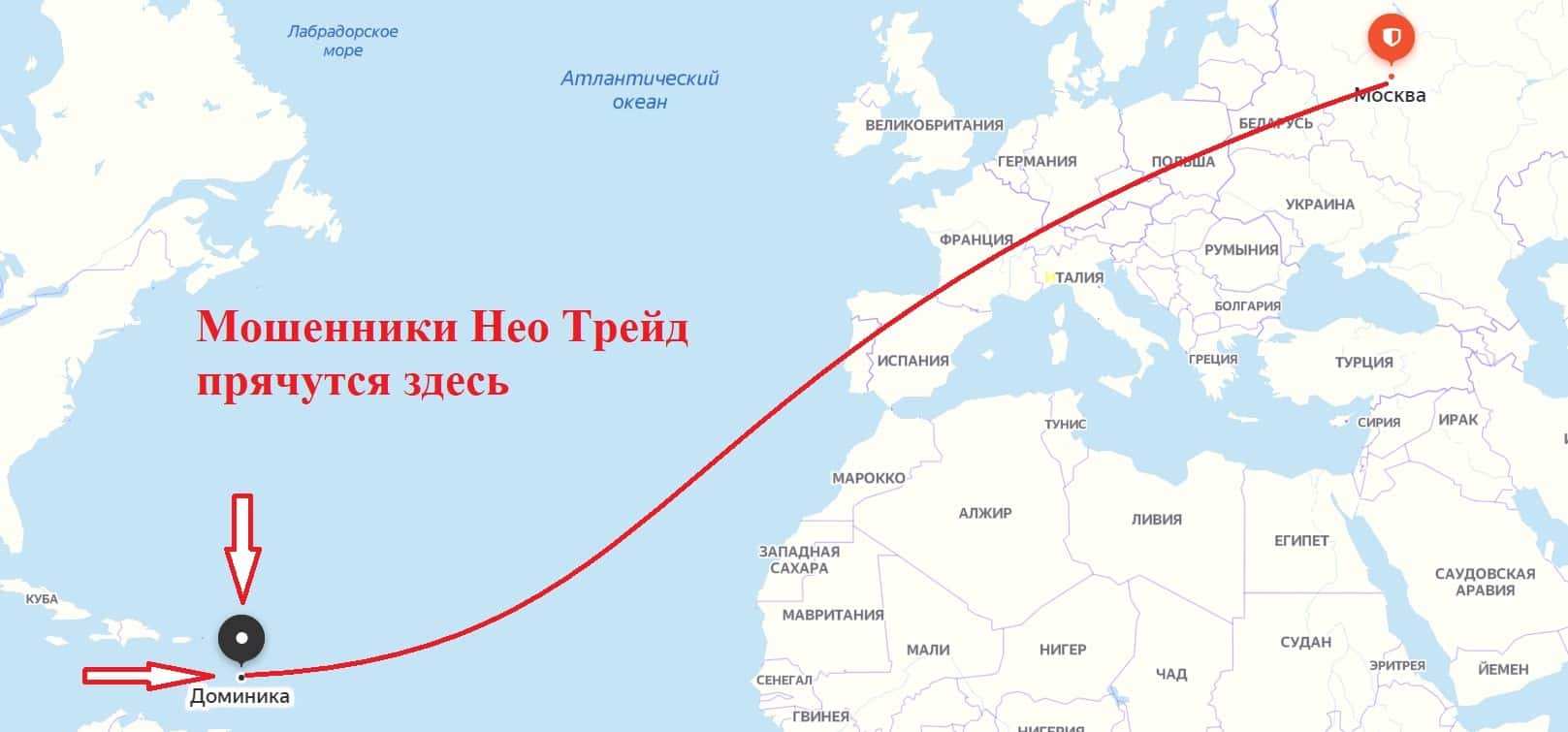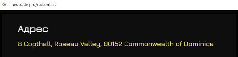На сайте мошеннической организации Neo Trade указано, что юридическое лицо, которому принадлежит бренд, зарегистрировано в оффшорном государстве Доминика.