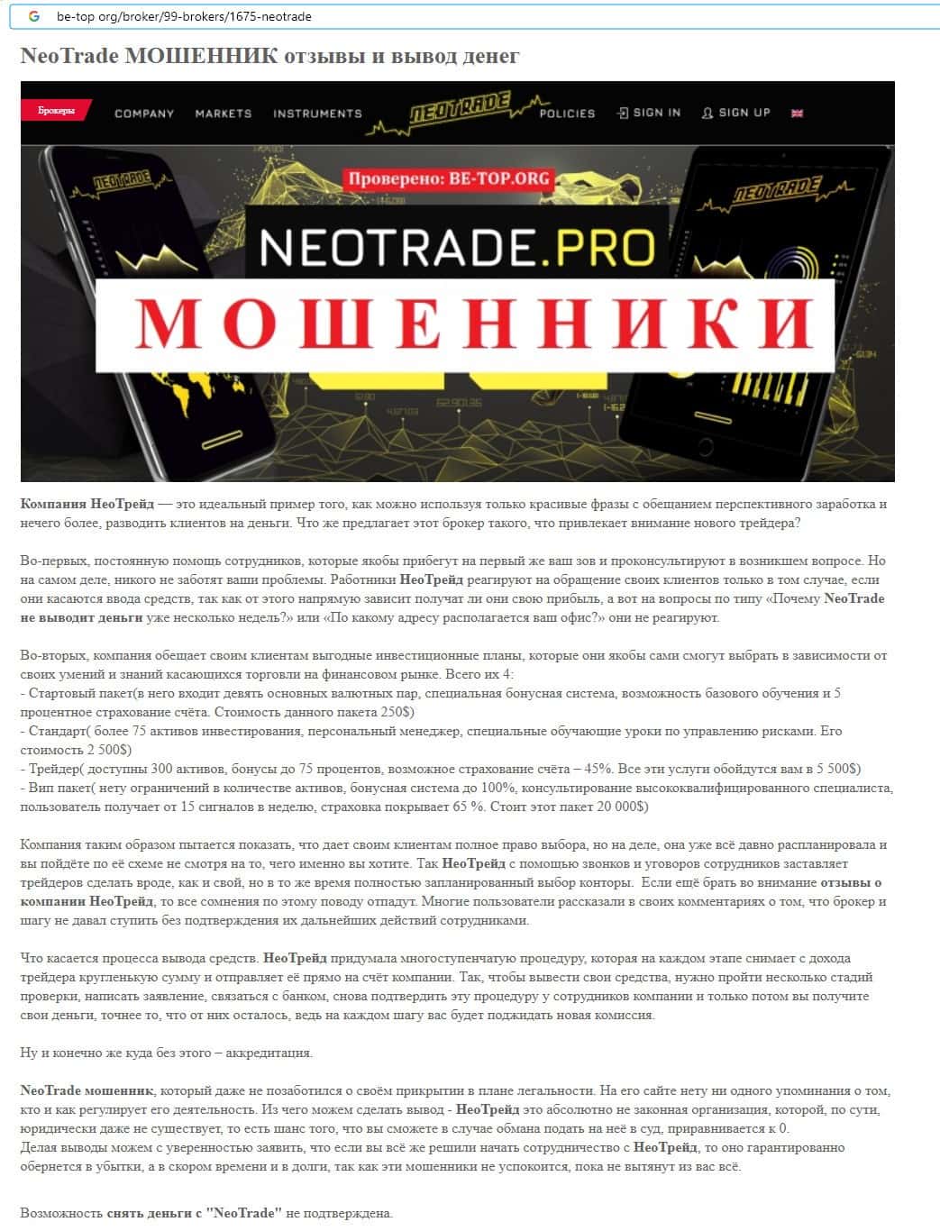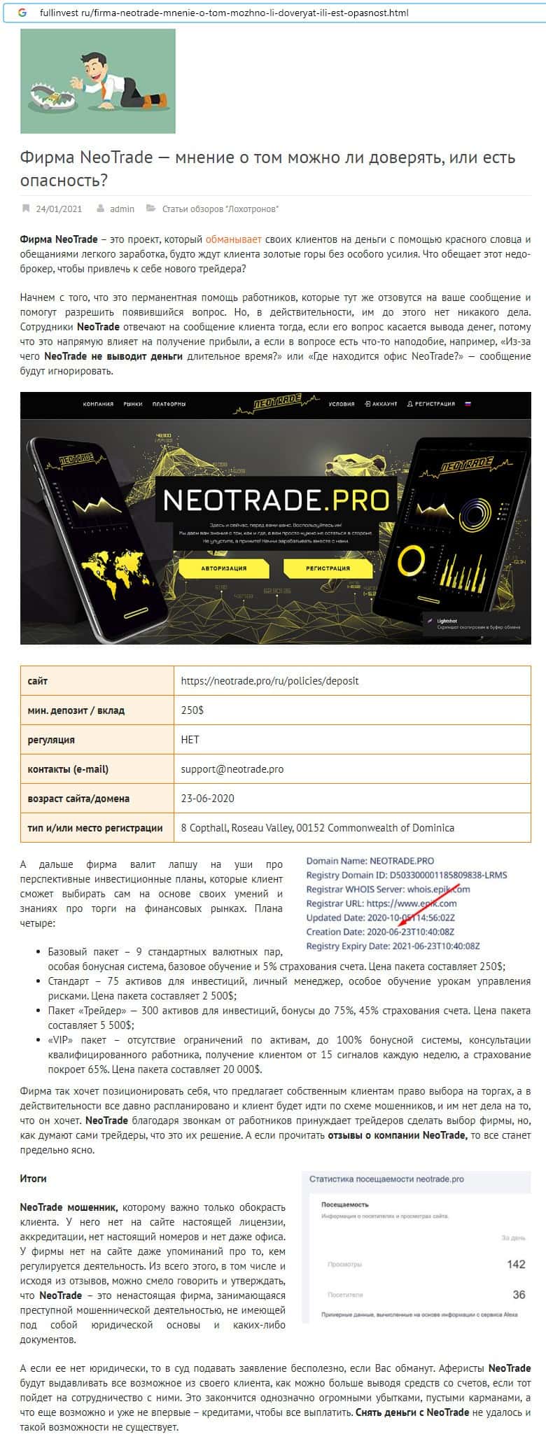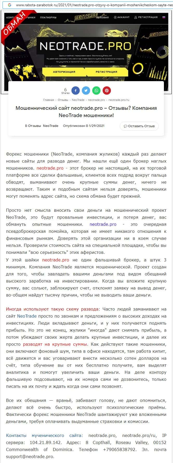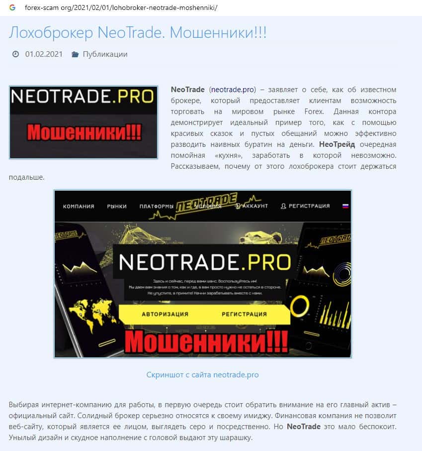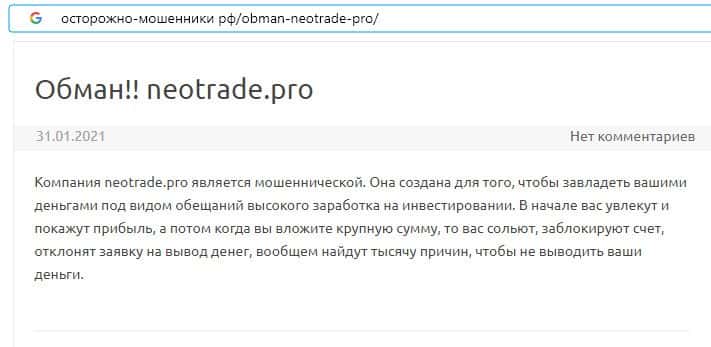 Отзывы о скам-брокере Neo Trade, ныне присутствующие в сети-интернет