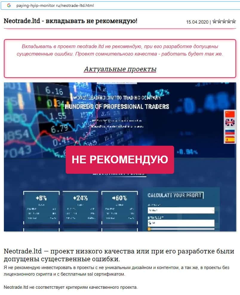 Интернет-проект Нео Трейд по мнению сайта paying-hyip-monitor ru является подозрительным и сомнительного происхождения.
