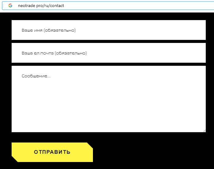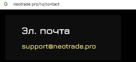 Мошенники Neo Trade на своем официальном интернет-ресурсе указывают адрес электронной почты, а именно: