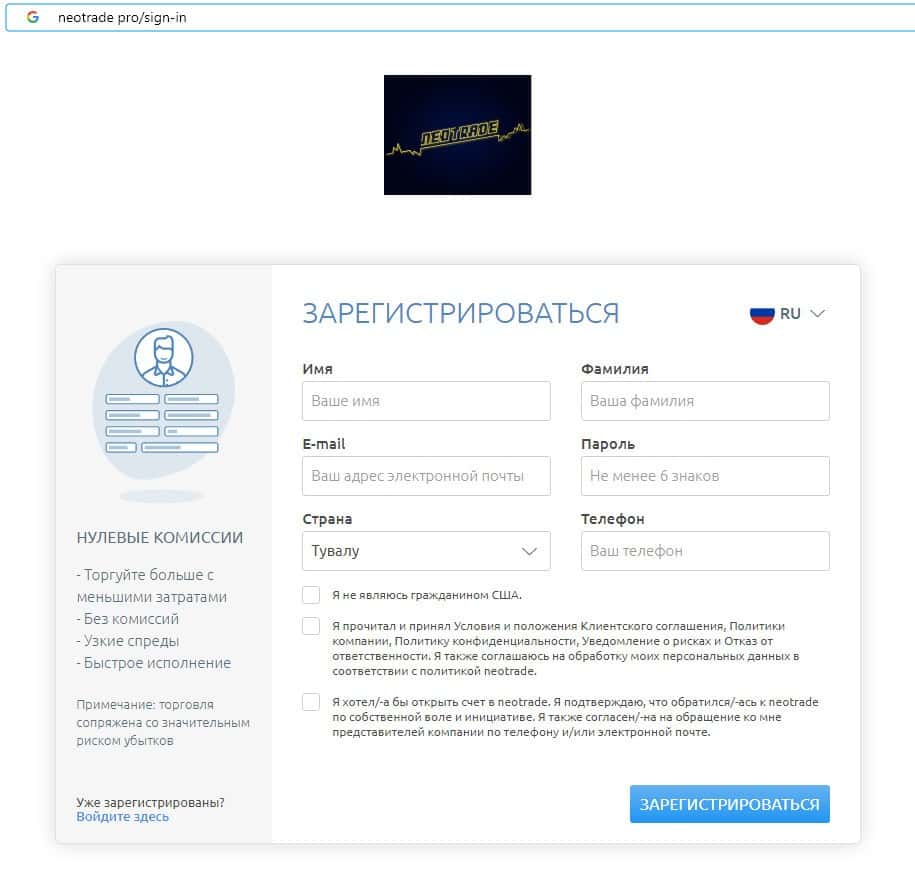 Мошенники Neo Trade ведут сбор данных о клиенте, предлагая заполнить бланк, где просят указать свое имя, фамилию, адрес электронной почты, страну проживания и номер телефона.