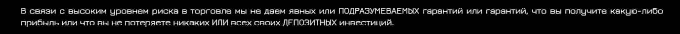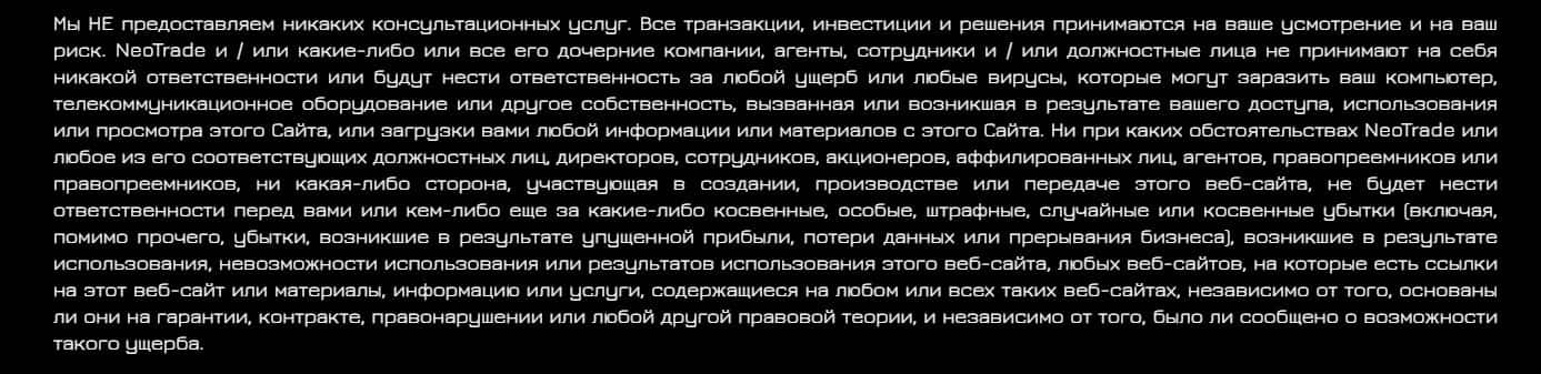 Обманщики Нео Трейд уведомляют клиентов о том, что их компания не дает никаких гарантий того, что результат торговли будет приносить прибыль.