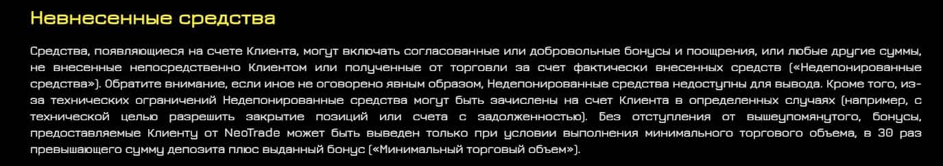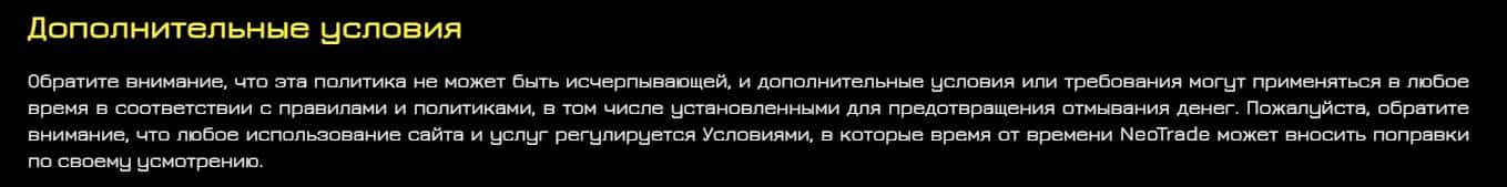 Скам-брокер Нео Трейд также может прекратить обслуживание клиента в любое время без предварительного уведомления и без особых на то причин.