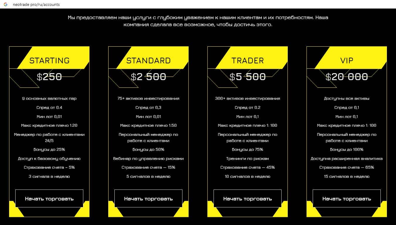 Жулики Neo Trade предлагают клиентам на выбор 4 типа торгового счета: Starting, Standard, Trader, а также VIP. Реальный Форекс стартует в основном с суммы в 100000 долларов.
