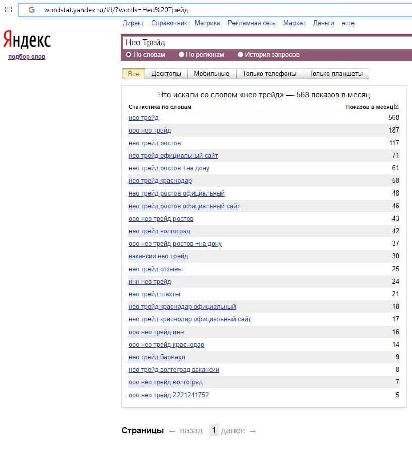 Количество брендовых запросов Нео Трейд в поисковике Yandex