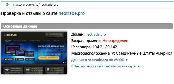 Проверка интернет-портала шулеров Нео Трейд на trustorg com показала, что возраст домена определить невозможно, мы имеем дело с очередной мошеннической организацией.