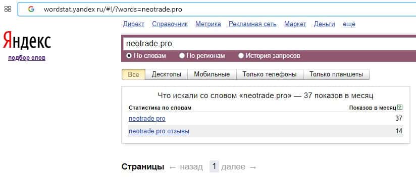 Количество брендовых запросов название домена компании "neotrade.pro" на Яндекс Вордстарт составило 37 показов за месяц.