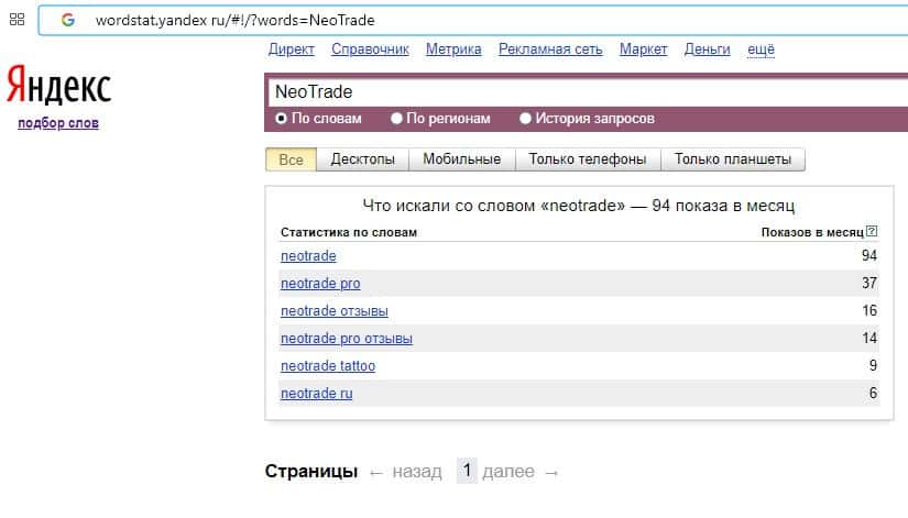 Количество запросов по бренду англоязычного названия компании "NeoTrade" на Вордстарт Яндекс Ру составляет 94 запроса за месяц.