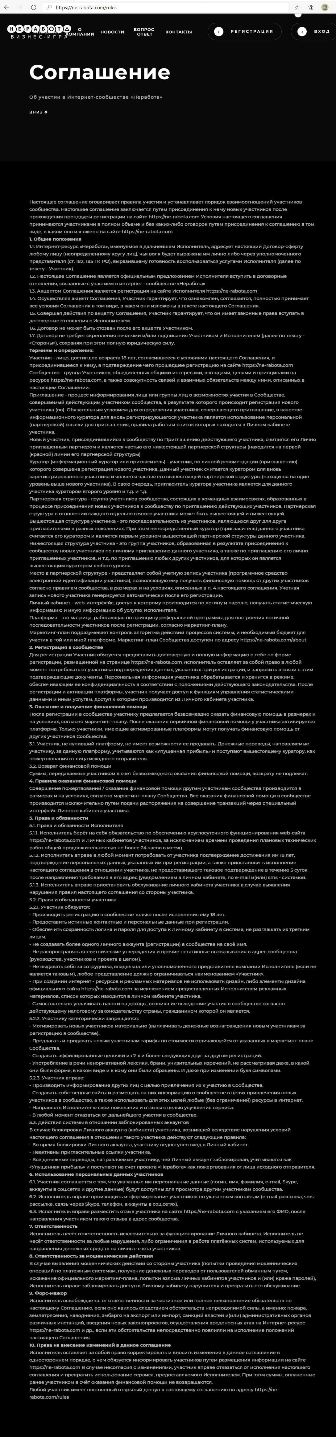 Все, что вы сможете узнать из этого договора с НеРабота - что вступаете в пирамиду, в которую ради прибыли придется заманивать все новых и новых людей, при этом контора не обещает, что вывод денег пройдет без проблем.Здесь можно ознакомиться с этим договором, рассказывающем о принципе создания пирамиды.